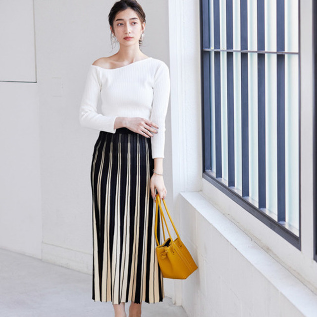 違う色を組み合わせるとカジュアルです。ホワイトスカートは夏らしく明るい表情に。トップスは裾INすると、くびれたウエストから広がる、スカートの美しいシルエットが引き立ちます。