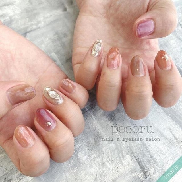 繊細なラメで華やかさもあるジーニッシュの61番は、深みのあるシアーブラウン。まるで琥珀のようなアンティーク感と優雅さが魅力のニュアンスネイルです。