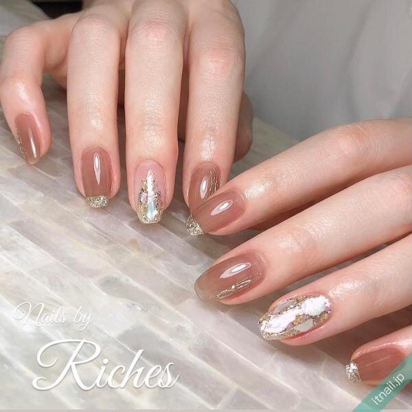 ブラウンやベージュといった落ち着いた大人カラーのネイルでまとめて、グリッターの敷き詰めネイルも上品に♪大人向けの品のあるネイルになるので、オフィスはもちろん、きちんと感が欲しいときにもおすすめです。