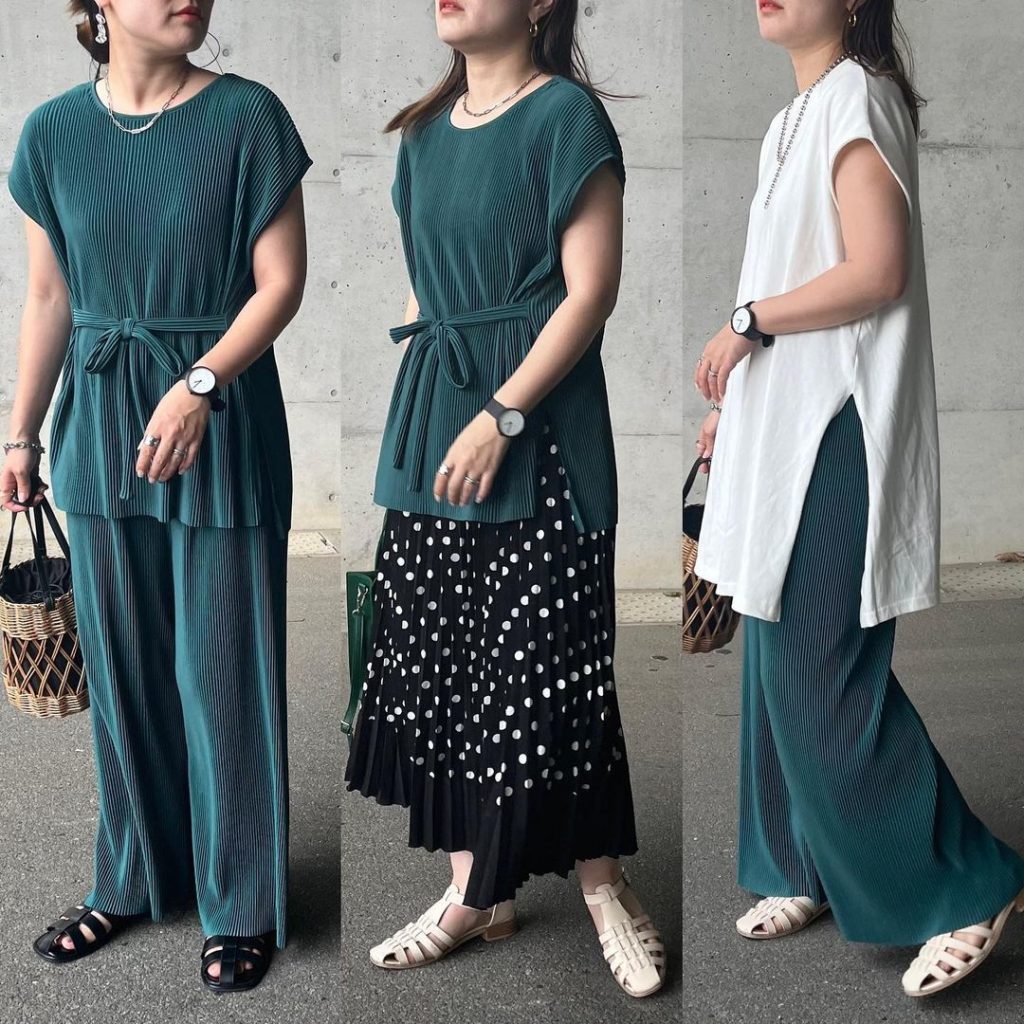 きらめくプリーツが上品なセットアップは、シワになりにくく、縦ラインでスマートな印象も手に入ります。フレンチスリーブとワイドパンツで着心地はリラクシーです。深みのあるグリーンは品格も感じられる色で、秋コーデにもマッチ。