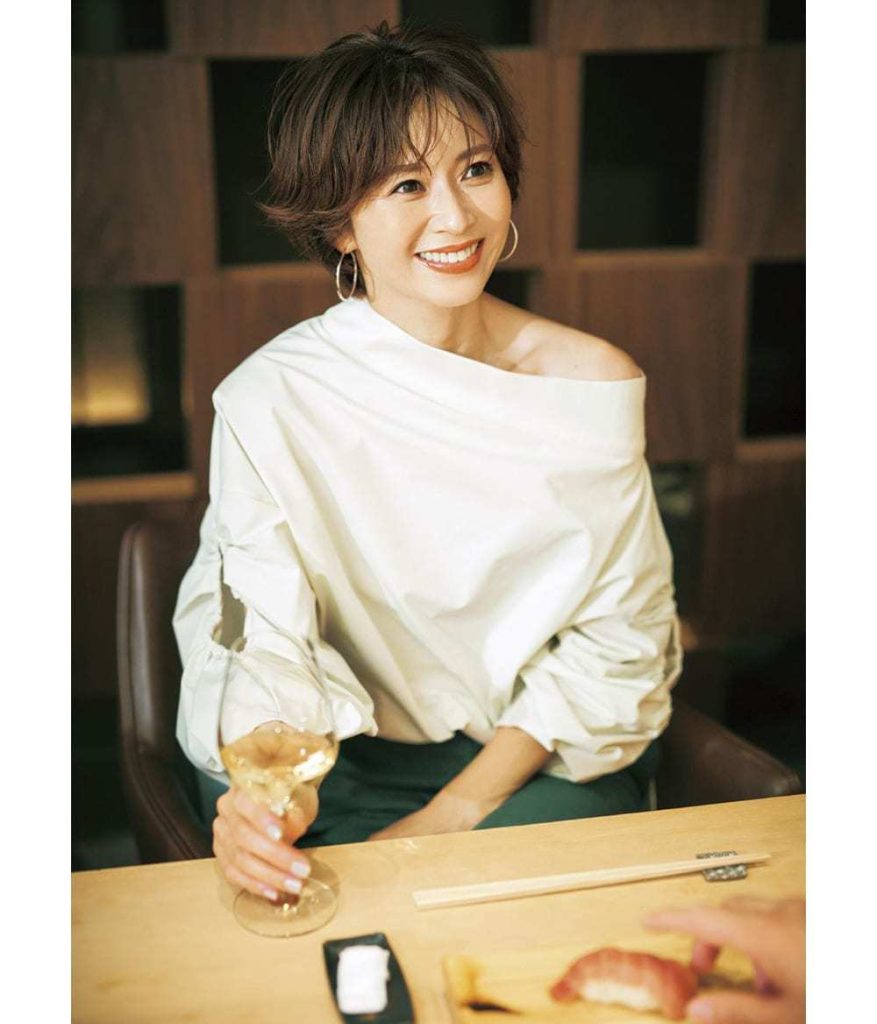 オフショルだと年齢的にも場所柄的にも抵抗があるけれど、ワンショルの肌見せなら挑戦しやすい。女同士だからこそいち早くトレンドを取り入れて話題作りに一役。腕のスリットからのさりげない肌見せも可愛い。