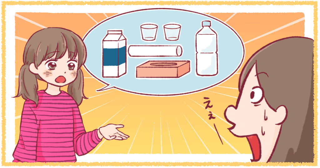 水が入っていた底が四角いタイプのペットボトルを準備していたママ。しかし持っていく直前になり「炭酸飲料が入っているような底が丸いペットボトルで」と、急に学校から形状の指定をされたこともあったのだとか。ペットボトルの準備が必要とわかり次第、形状の確認をしておくとよさそうですね。