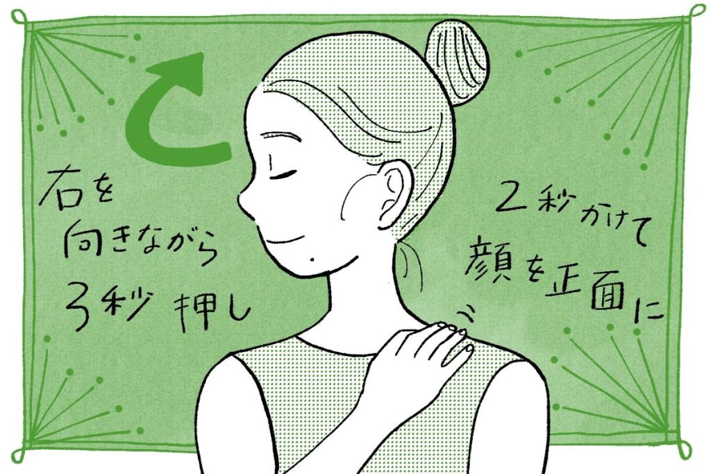 顔は正面を向き、右手の中指を左側の肩井のツボにあてます。肩の位置は変えずに右を向きながらツボを3秒かけて軽く押し、中指はツボを押したまま2秒かけて顔を正面に戻します。再度右を向きながら1回目よりやや強く3秒かけて押し、2秒かけて顔を正面に戻しながら押す力を緩めます。反対側も同様に行います。