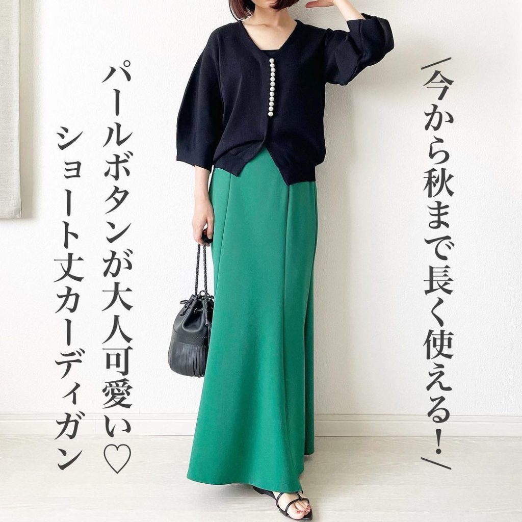 丸みのあるコクーンシルエットと、ビッグパールのボタンがフェミニンなカーディガン。1枚で大人っぽくてかわいい魅力を引き出してくれます。相性がいいボトムスはスカート。ブラックカーデなら、鮮やかグリーンスカートが映えます。