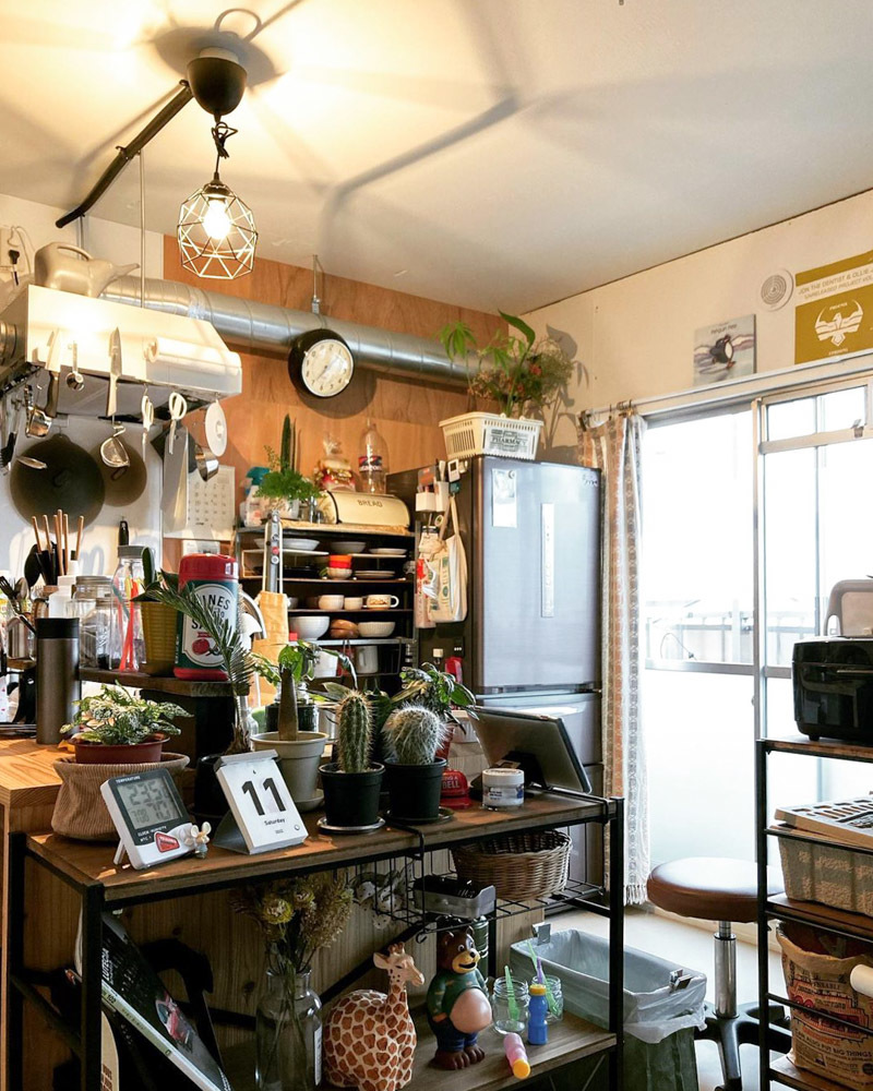 キッチン横のオープンラックや、食器棚や冷蔵庫の上も活用して、お部屋のあちこちにたくさんの植物が並んでいます。
