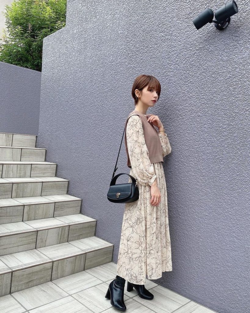 花柄ワンピースにニットベストを重ね着したコーデは、完成度が高いです。ニットベストは短め丈でウエスト位置が高く見えるため、スタイルアップにもなります。セットはもちろん、それぞれ別のアイテムと組み合わせて着てもよし。