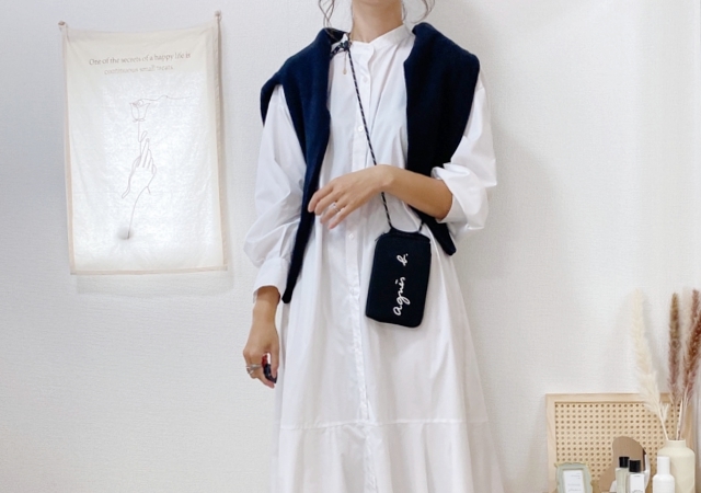 すっきりラインのワンピースにオーバーサイズのシャツを羽織った、こなれ感◎なカジュアルコーデ。