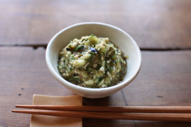 水ナスときゅうりをおいしく食べられるサラダ。練りゴマをベースにしたツナのドレッシングはこってりとした味つけで、さっぱりとした夏野菜によく合います。仕上げにミョウガをかけて召し上がれ。