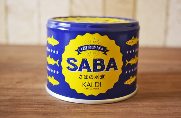 材料で指定されているカルディのさばの水煮は、青と黄色の色合いが特徴的。お値段は通常価格199円(税込)です。1缶あたり190gとたっぷり入っています。