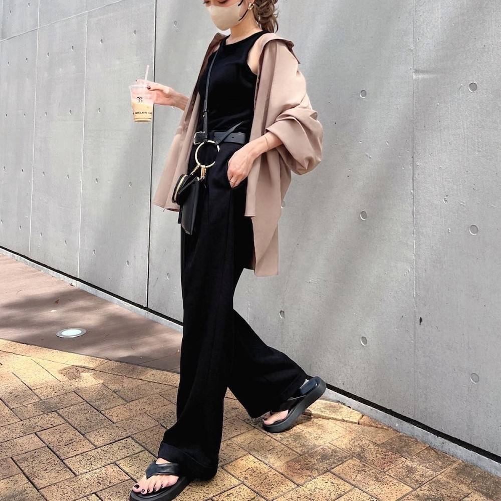 最後にご紹介するのは、アメリカンスリーブのタンクトップと黒パンツを合わせたうえに、シャツをゆるっと羽織る初秋にピッタリなコーデです♡