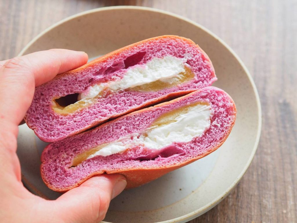 カットしてみるとご覧の通り、さつまいもの皮のような鮮やかな紫色の生地が顔を出しました。あまりに鮮やかな紫にちょっぴり驚きましたが、クチナシ由来の色素を使っているようですよ。