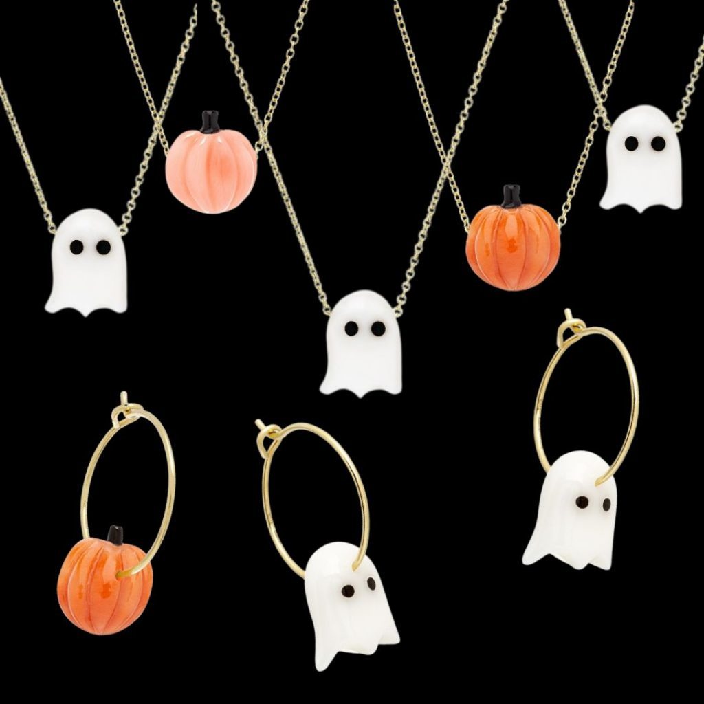 ピンクとオレンジコーラルのパンプキンシリーズもネックレスとピアスの展開があり、肌馴染みの良い色で顔周りを明るくしてくれ、ハッピーな気持ちになれそう。Trick or TreatのTreatとしてヴェネチア地方の伝統的な技法であるブラーノグラスで作られた キャンディセットも3つのバリエーションで登場します。