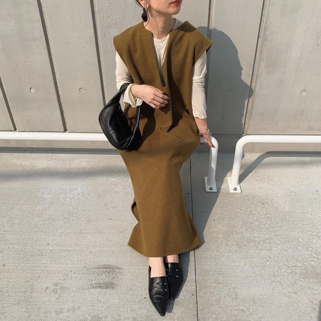 引き締まって見えるブラックだと、より細見えします。ボリュームスリーブのブラウスを合わせられるのも、ノースリーブワンピだからこそ。くすみカラーのブーツや柄バッグが映える、モノトーンレイヤードの完成です。