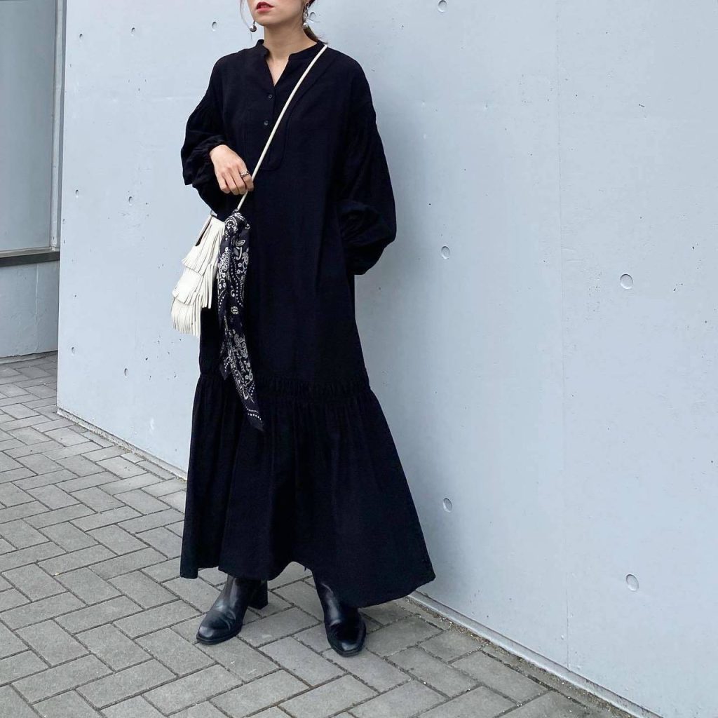 最後にご紹介するのは、秋らしく大人っぽい印象のブラックのロングワンピースを主役にしたコーデです。