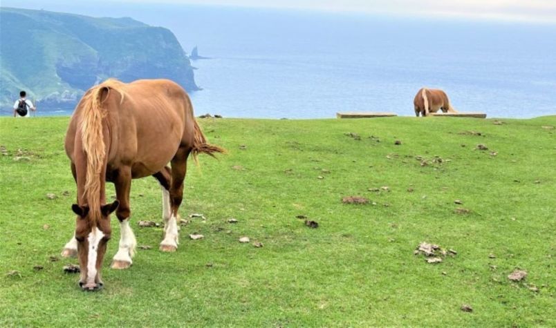 日本海の大海原と断崖の絶景が目の前に広がる展望所。牛と馬がのんびりと草を食む向こうには、荒々しい崖と遠くまで続く緑が。今いる場所や時間を忘れて、いったいここはどこ?という錯覚に陥りそうなくらい、非日常的な景観が広がっています。通天橋へと続く遊歩道からは、海抜257mに垂直に切り立つ摩天崖を撮影することができます。
