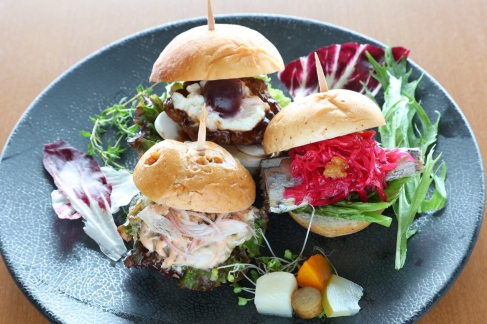 2.サンマ、三年牡蠣、岩手県産短角和牛のミニバーガーセット