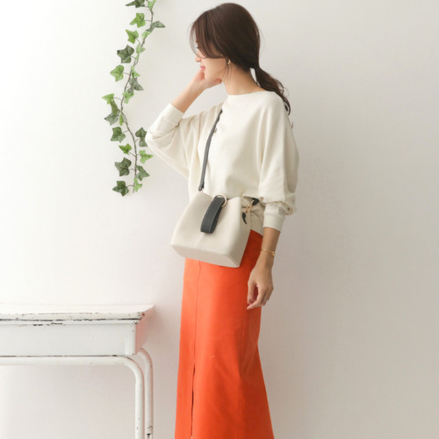 深いVネックとすっきりとしたシルエットのジャンパースカートと、メロウネックが可愛らしいプルオーバーのセットアイテム。そのままでトレンドコーデが完成します。