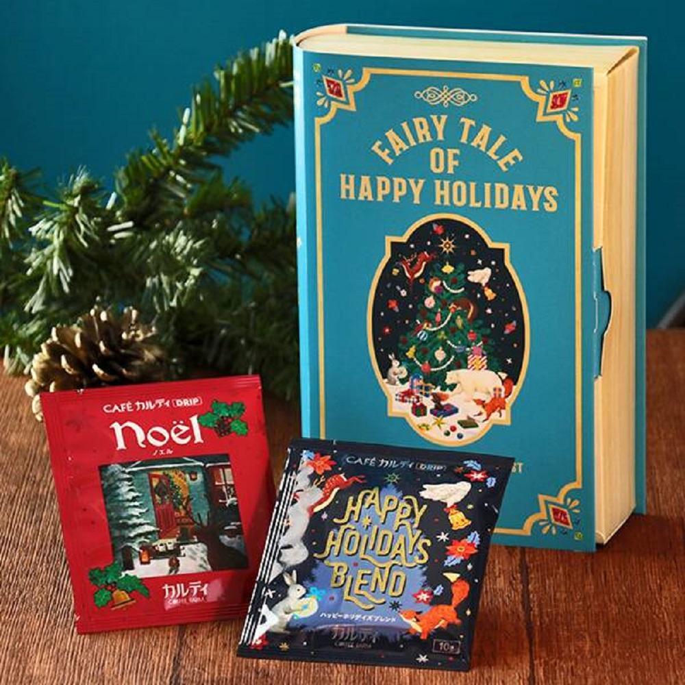 ブック型のボックスに、冬限定ドリップコーヒー「ノエル」「ハッピーホリデイズブレンド」を各4袋ずつ詰め合わせた商品です。価格は1200円。