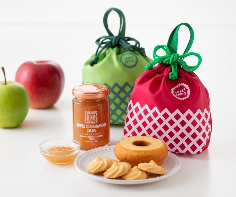 同日から紀ノ国屋で開催される「りんごまつり」(※一部店舗を除く)にあわせて登場するもので、焼き菓子やジャムが可愛い巾着に入っています。