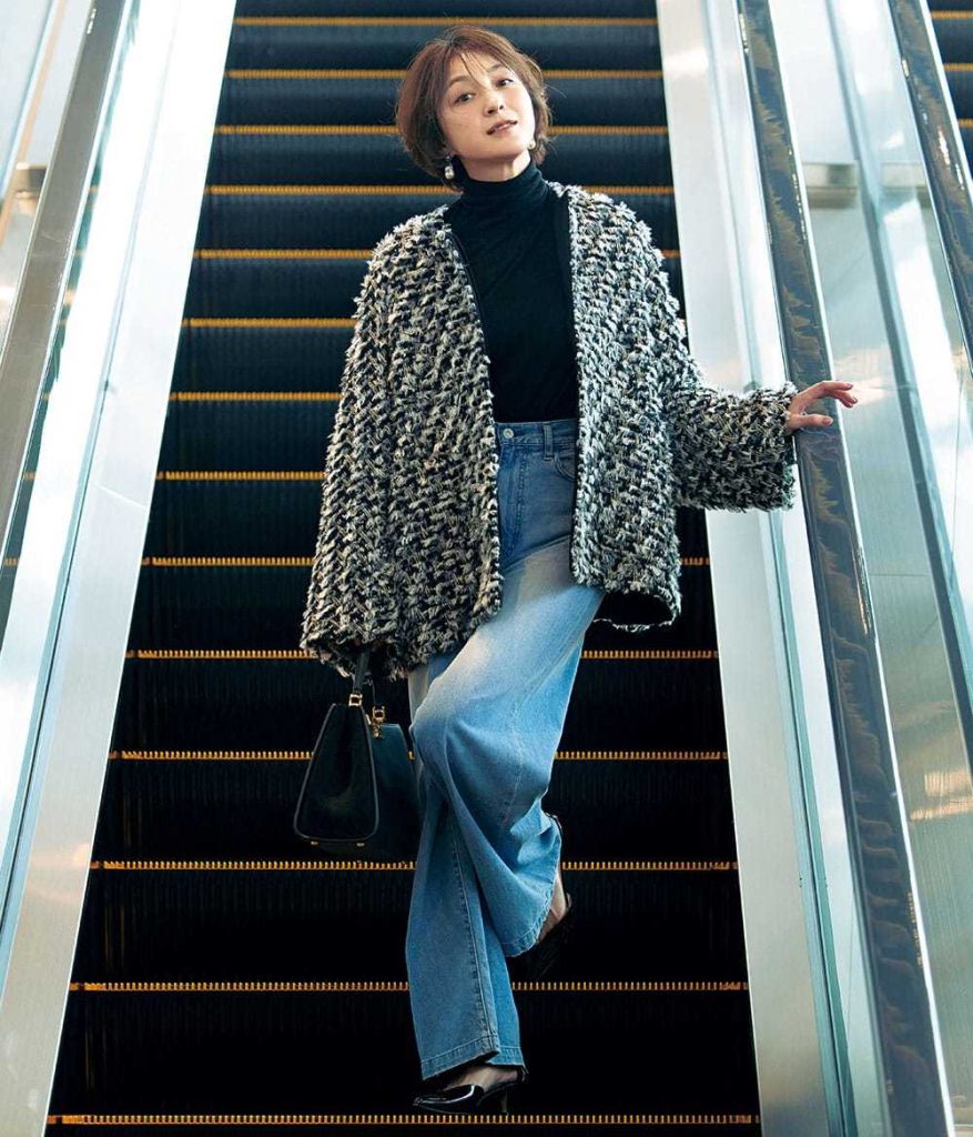この秋冬人気再燃のツイードジャケットはオーバーサイズを選べば、今年らしいフレッシュ感に。広末さんも最近購入したというハイウエストデニム合わせなら、さらに今年らしさを後押しできます。