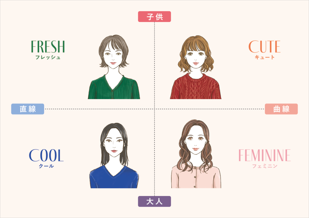 「顔タイプ診断®」とは、顔の印象やパーツをもとに分析し、似合う色や素材などファッションのテイストを導きだします。顔の形やパーツから世代感(子ども顔か大人顔)と、形状(曲線か直線)で診断し、上記4つの顔タイプ別に分類します。