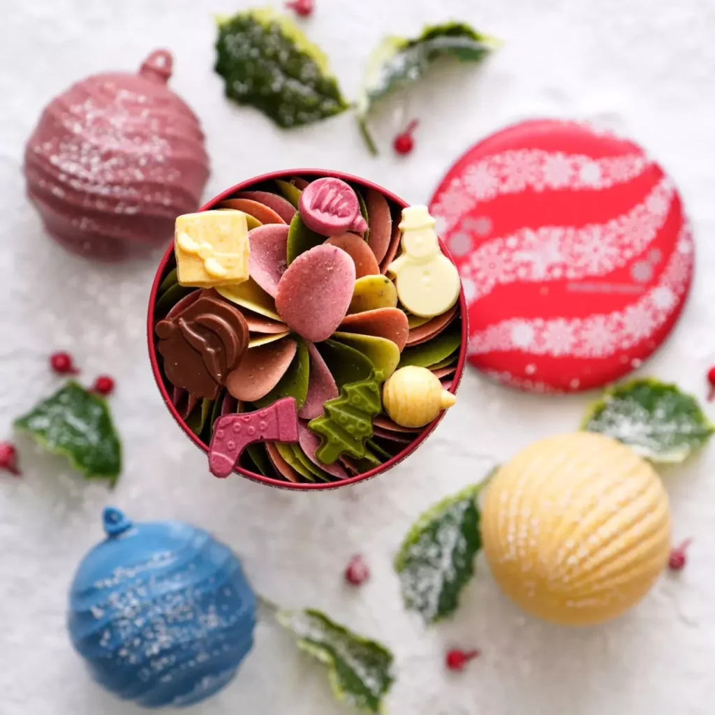 息をのむほど美しい、花びらのような繊細なつくりのチョコレート缶。色鮮やかなクリスマスカラーが、ホリデーギフトにぴったりな一品です。