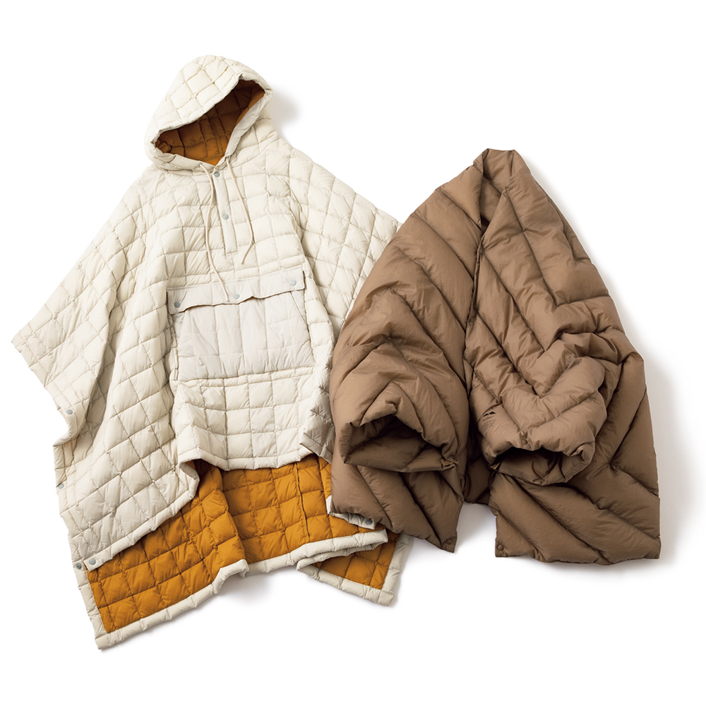 ざっくり被れる大判シルエットが便利。インナーダウン専業ブランド発のポンチョだから、薄手でかさばらず、かつ暖かい。