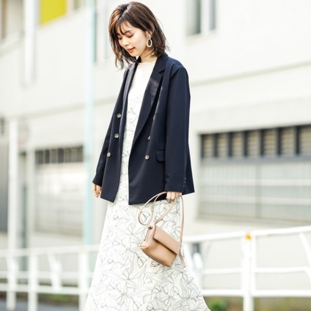フードにフェイクファーがあしらわれていて、エレガントな表情を作ってくれるジャケット。顔周りがあたたかく、防寒性も優れています。モカはまさに秋冬にマッチする色。ワンピースのレイヤードコーデが上品に見えます。