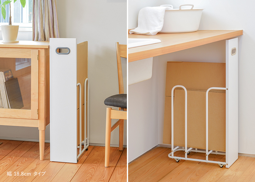 このストッカーは目隠し付き。そのため、置く場所や見える方向を考えて収納すれば、ダンボールを見せることなくストックできます。