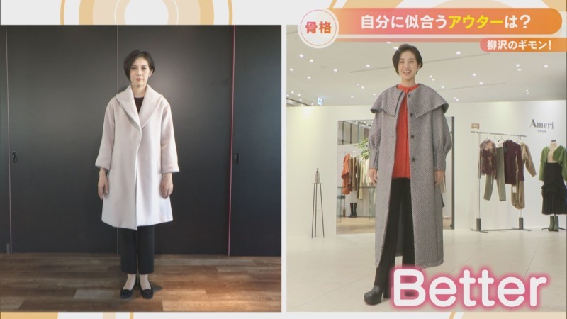 自分のタイプが分かったら、次は自分に似合うアウター探し。村尾さんと共に、名古屋駅の「タカシマヤ ゲートタワーモール」へ。おしゃれな女性たちに話題のブランド「アメリ ヴィンテージ」で、タイプ別にオススメアウター選び!この冬、着たくなるアウターのトレンドもチェックしました!