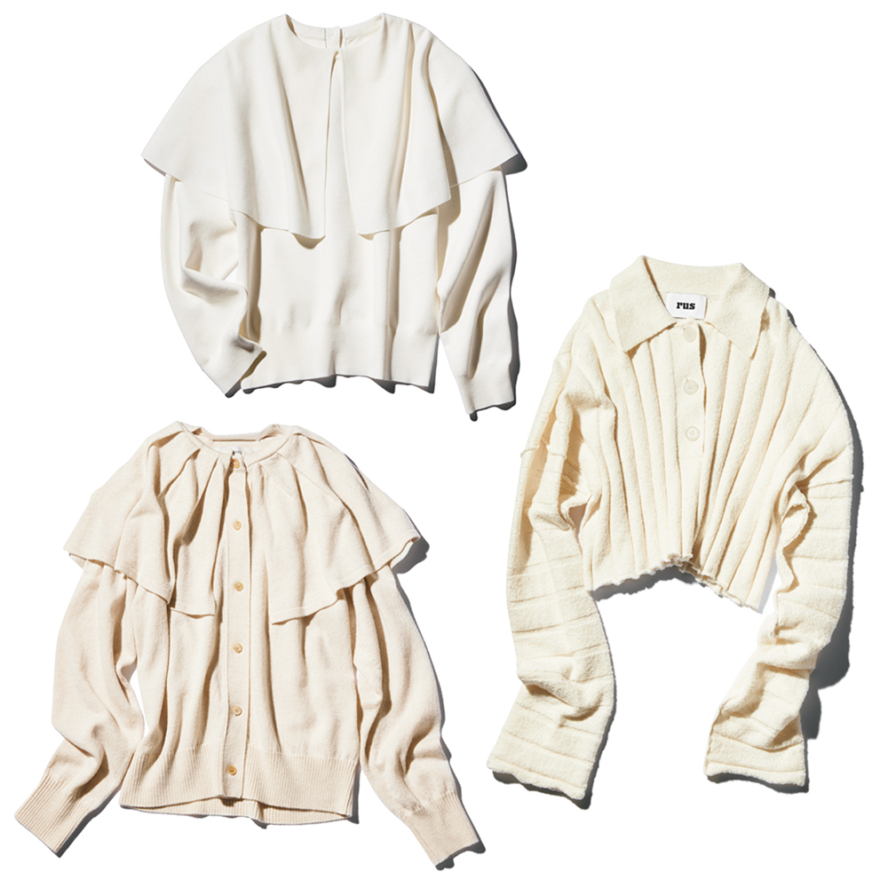 今季はブラウス見えする甘めデザインをはじめ、モードに着こなせるものまで衿付きニットが豊富。首まわりにデザインがあることでネックラインや顔まわりもスッキリ華奢見え。アウターから衿を覗かせるのも今年っぽいバランスで、おすすめです。
