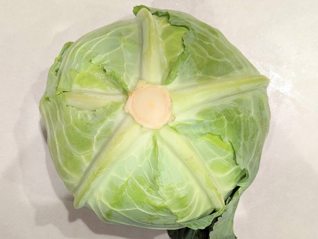 キャベツを選ぶときのポイントは、裏側にある5本の筋の間隔が均等になっているかどうか。