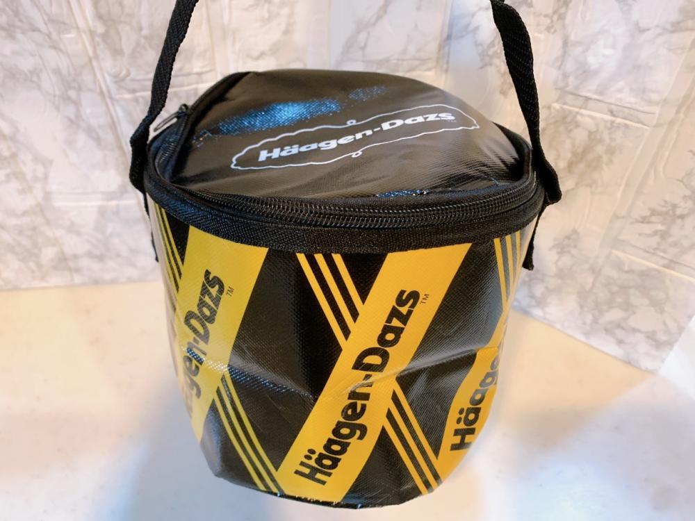今年の保冷バッグは、黒を基調に、マスタード色のストライプやハーゲンダッツの文字があしらわれています。フタ部分には白でハーゲンダッツのロゴがデザインされています。
