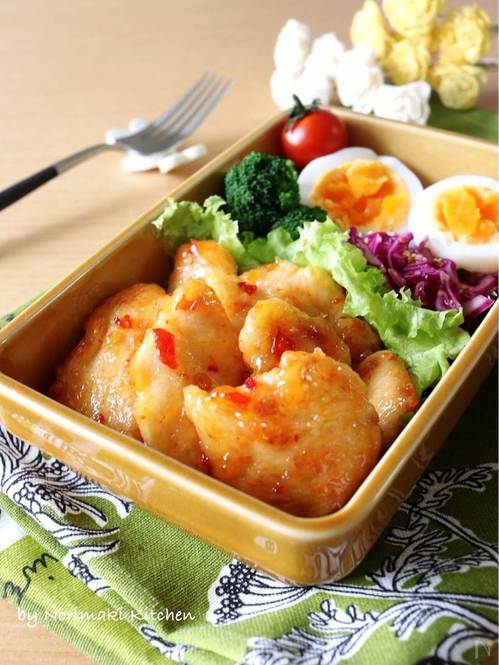 厚切りハムのようなボリュームがあるお肉の正体は鶏むね肉。蒸し焼きにすることで、柔らかくジューシーに仕上がっています。醤油ベースの味つけは間違いないおいしさ。お好みで青菜や半熟玉子を合わせて召し上がれ。