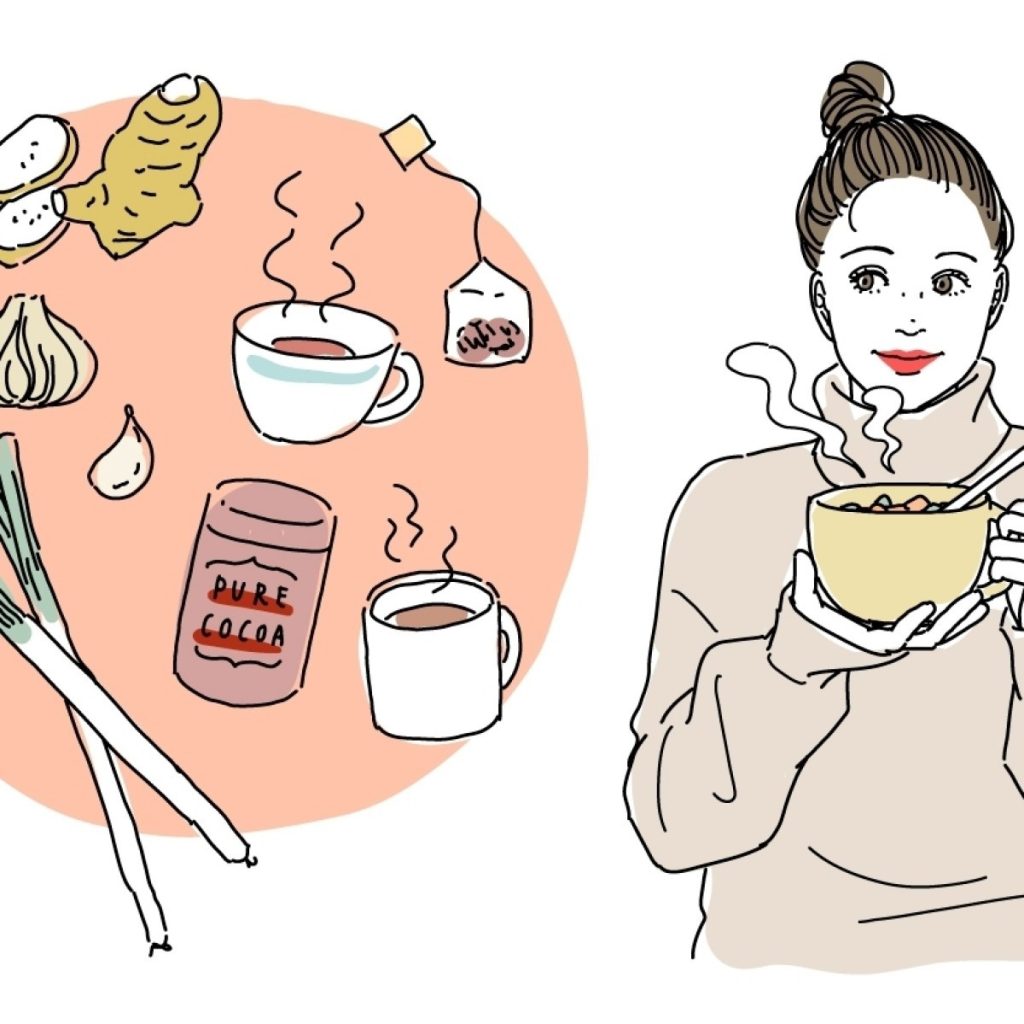 飲みものは紅茶、ほうじ茶、烏龍茶、ココア、生姜湯などをホットで。また、朝は1日の中でも体温が低く、体内の水分が失われているタイミングなので、白湯を飲んで動脈や毛細血管を広げ、血液の流れをよくして体を温めやすくしましょう。