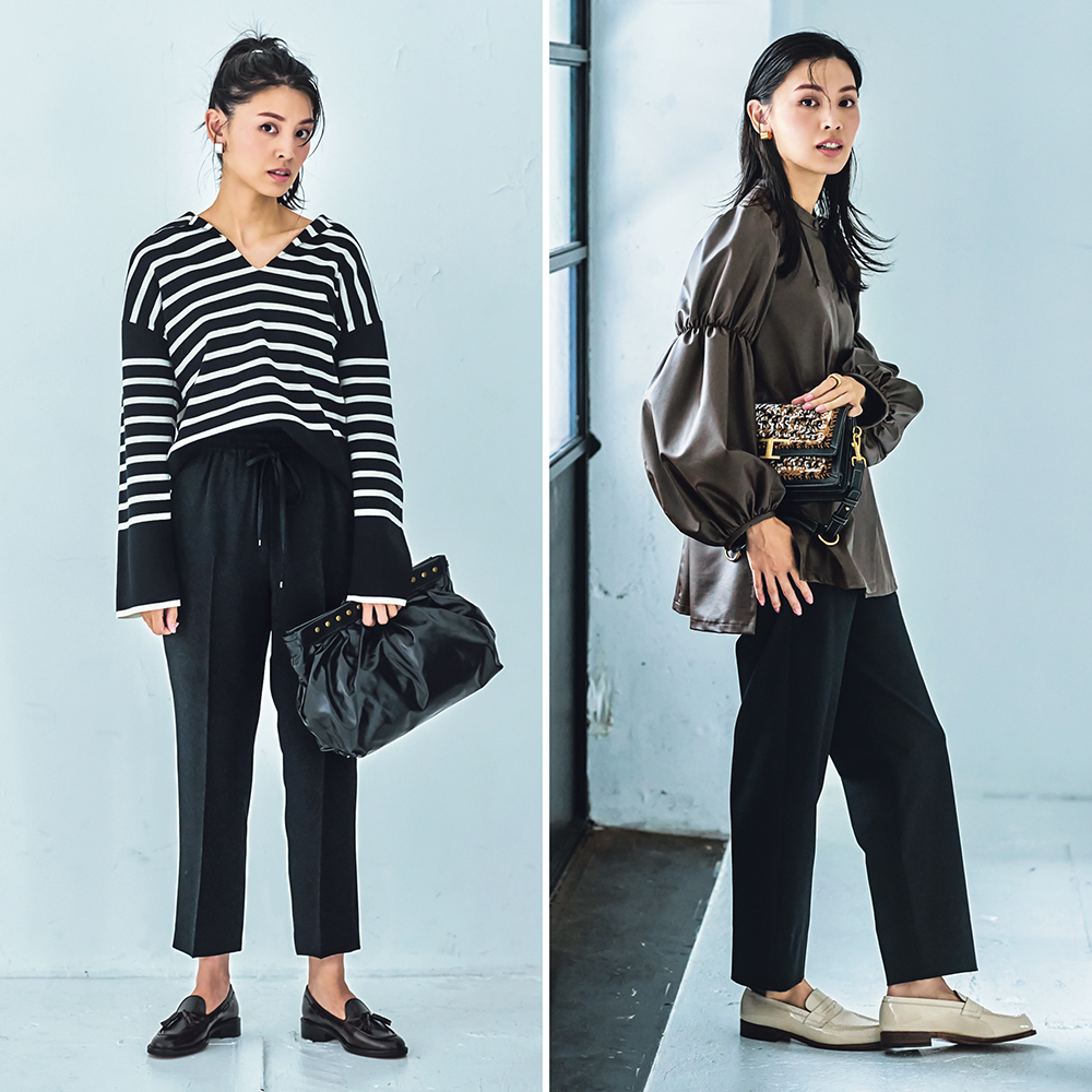 オーソドックスな黒やネイビーのきちんとパンツ。大きな違いはないはず、と無難なものを選んだり、昔買ったのをずっとはき続けているならもったいない! 選びや合わせ次第で、まだまだ真面目パンツのオシャレの可能性ってこんなに広がるんです。