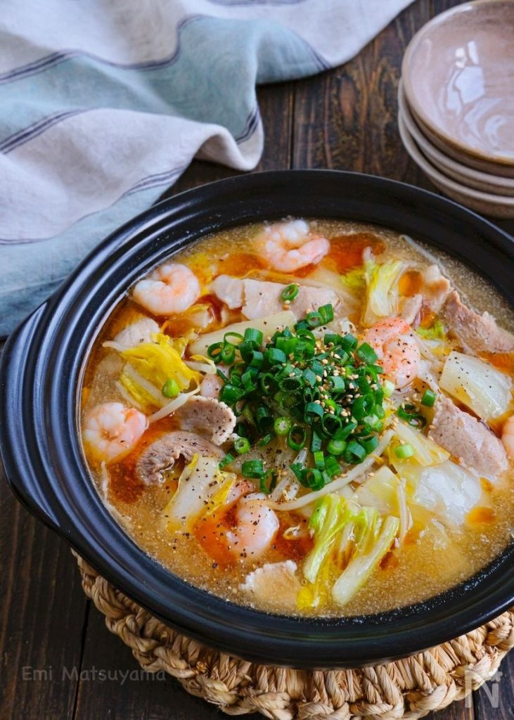 豚ばら肉・むき海老・もやし・白菜を入れて、とろみのある中華スープでいただく鍋料理。にんにくと生姜がきいたコク旨スープがおいしく、体もぽかぽかに温まります。シメはラーメンがおすすめです。
