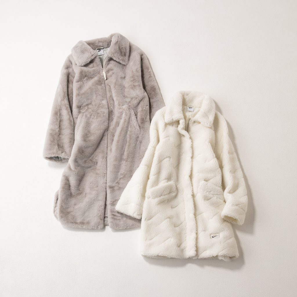 一見シンプルながらバックデザインにはナイキを象徴するスウッシュロゴが。ラウンドカットの裾に入ったサイドスリットのおかげでロング丈でも足さばきしやすく、アクティブなシーンにぴったりです。コート¥27,500(ナイキ/ナイキ カスタマーサービス)