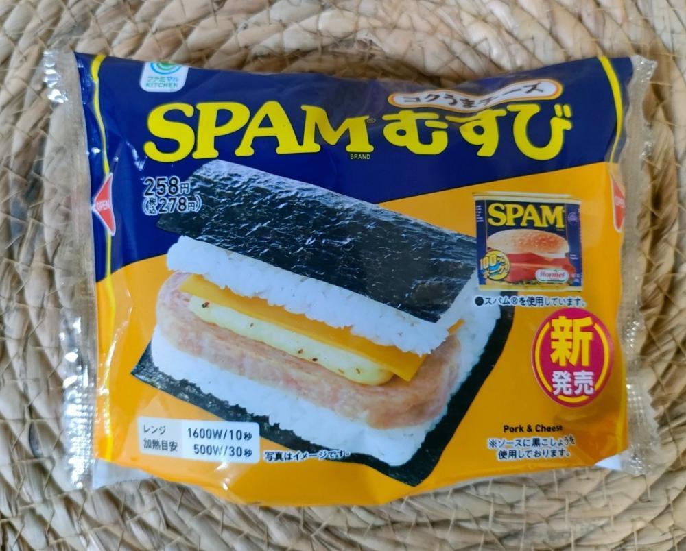 世界中で流通しているホーメルフーズ社の「SPAM」(ランチョンミート)を使用しています。新商品の「コクうまチーズ」は、チェダーチーズのスライスと、コクのある粉チーズとペッパー入りマヨネーズを、SPAMとはさんだおむすびです。