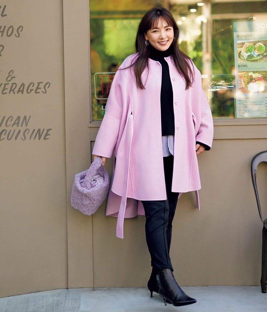 足元は華奢見えするヒールのあるブーツを選んでエレガントにキメるとキレイ色コートに気品を足せます。トラックソールみたいにごつめブーツはNG。