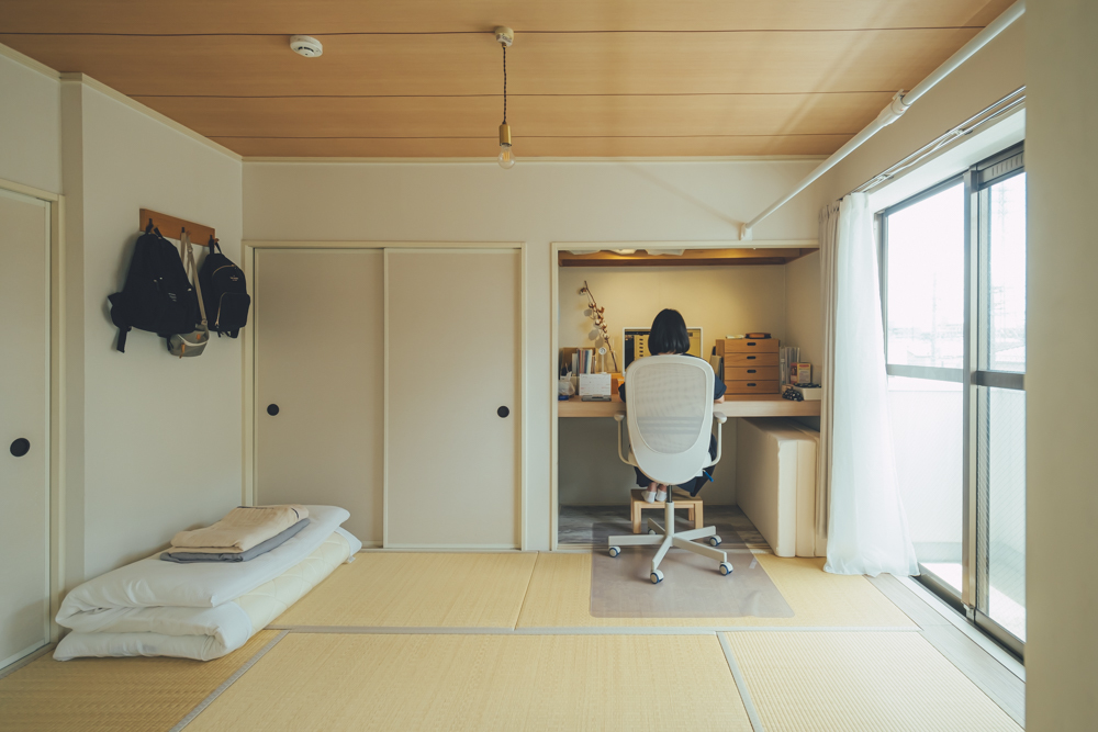 「勉強や仕事など何かを作業するのにいつも使っているスペースです。しばらくの間、在宅勤務でしたので、一日の中で過ごす時間が特に多い場所でした。押し入れ空間をデスクにすることで、三方が囲まれたブースのような雰囲気があり、集中して作業できるところが気に入っています」