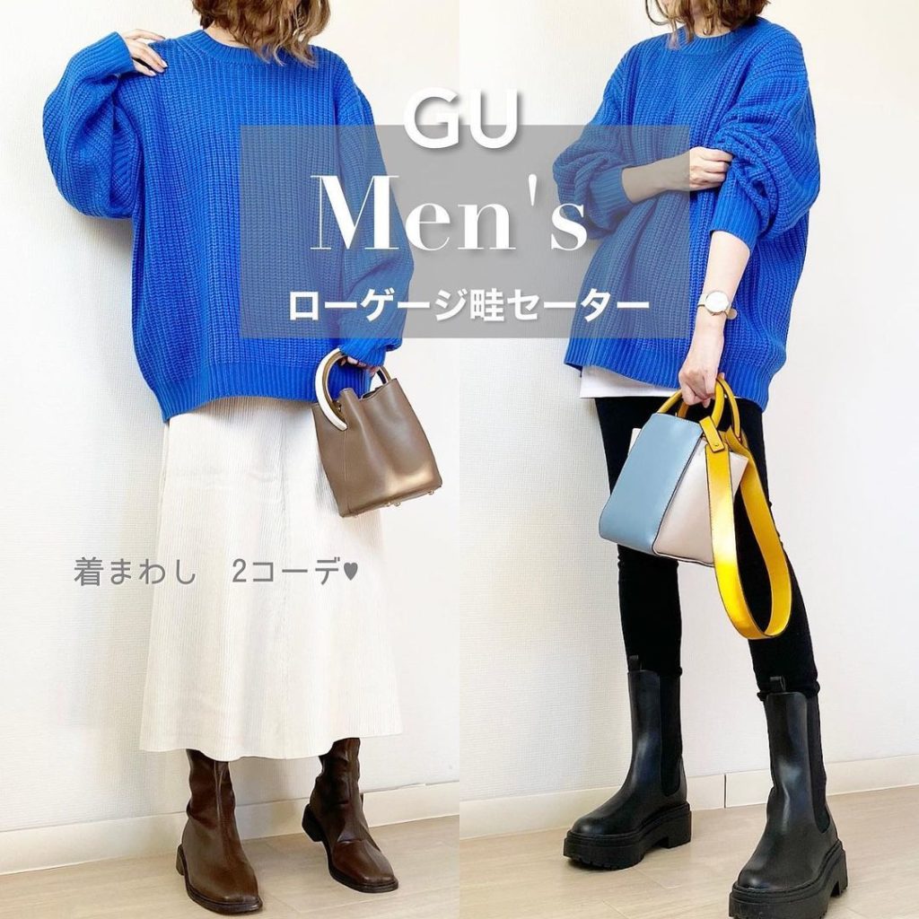 鮮やかなブルーが目を惹くのは、ざっくりとした片畦編みのクルーネックセーター。ユニセックスのボリュームシルエットですが、ローゲージのおかげで軽やかに見えます。ブルーはスカートとレディに、黒スキニーとクールに着回して。