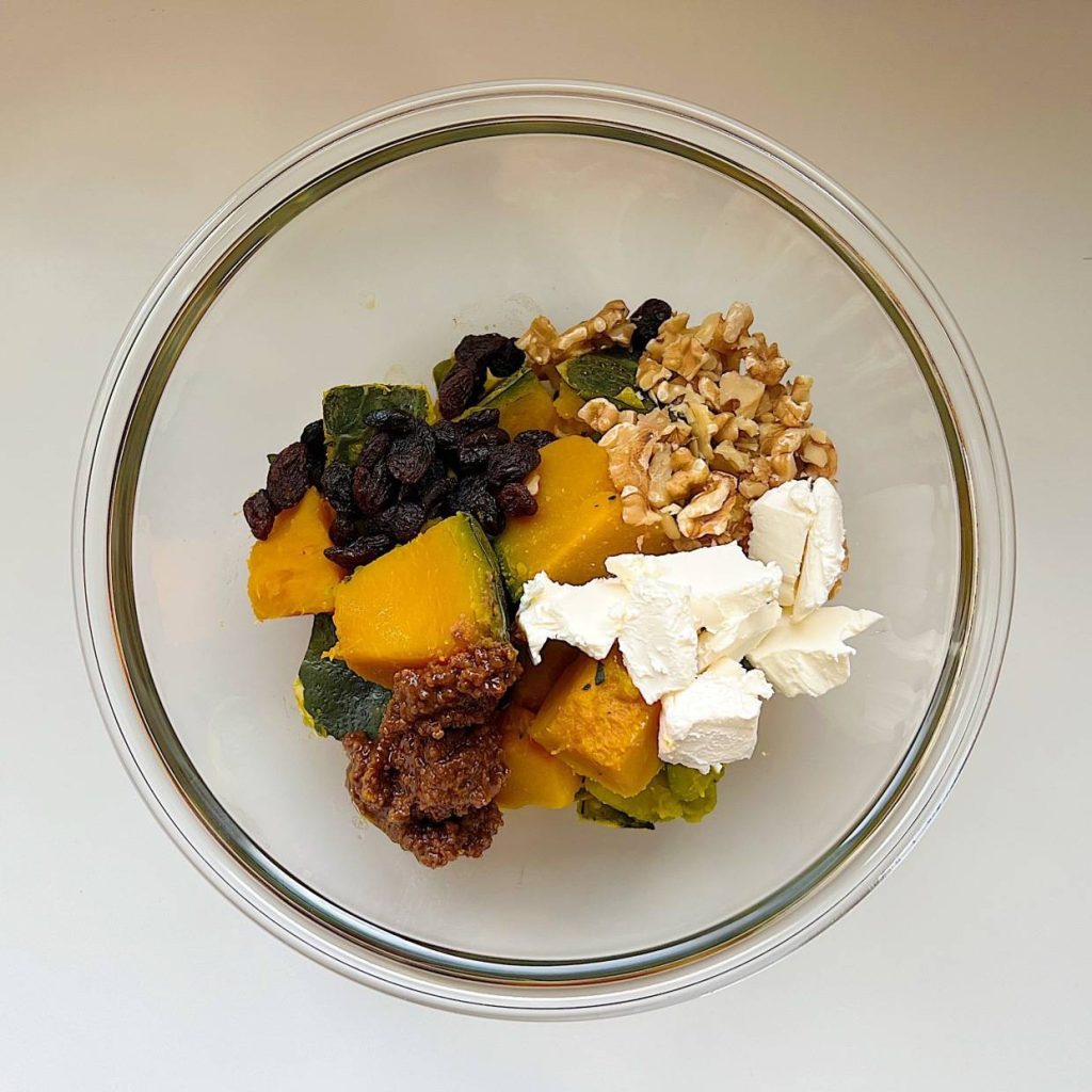 3. カボチャを荒く潰しながら、クリームチーズ、レーズン、刻んだくるみ、醤油麹を加えて混ぜたらできあがり。