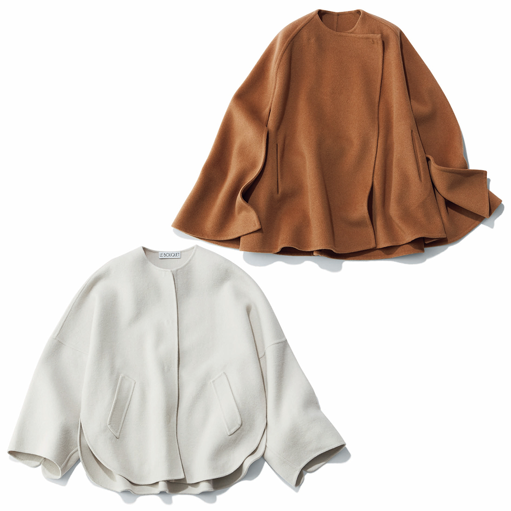 ダブルフェイスのケープジャケットで 丸みのある優しい印象に