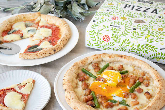 ダ・グランツァ監修のサルース オンライン マーケットオリジナル冷凍ピッツァは、定番の「マルゲリータ」と「カルボナーラ」の全2種類。黄緑のさわやかな箱に入って到着します。ピッツァは一枚一枚個装されており、単品でも複数枚のセットでも購入可能です。