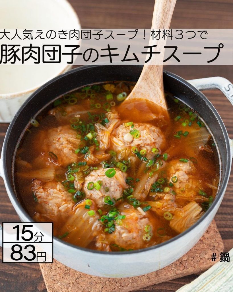 キムチと冷凍餃子を入れた、ピリッと辛くてボリューミーなスープ。仕上げに卵をふんわりと入れると、飲むというより“食べる”スープができあがります。包丁やまな板を使わず、鍋ひとつで完成するので楽ちんです。