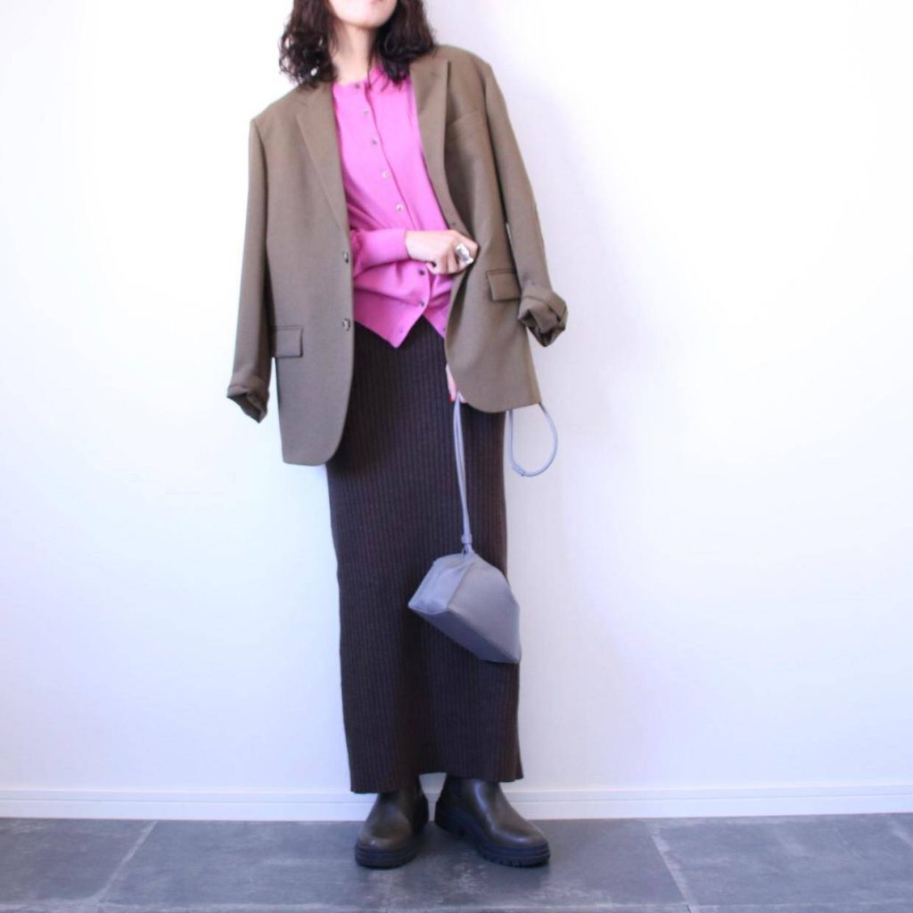 このとき、ジャケットのカラーをメンズライクなカラーにしておくと、より抵抗なくピンクを取り入れることができるのでお試しください!