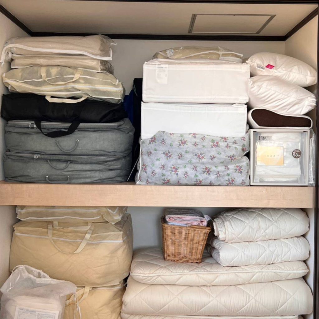 大きな敷き布団を優先的に収納してから、丈夫そうな布団ケースを積極的に活用して毛布や掛ふとんを収納していきます。1つの布団ケースに複数のアイテムを収納する場合は、一人分ずつに分けておくと使うときに便利ですよ。