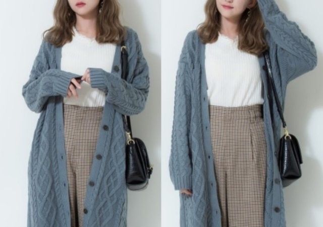 ざっくりとしたケーブル編みのロングカーディガンは、膝丈のたっぷりとした長さで体を包みこんでくれます。寒さが和らいだ日には、アウターがわりにも。