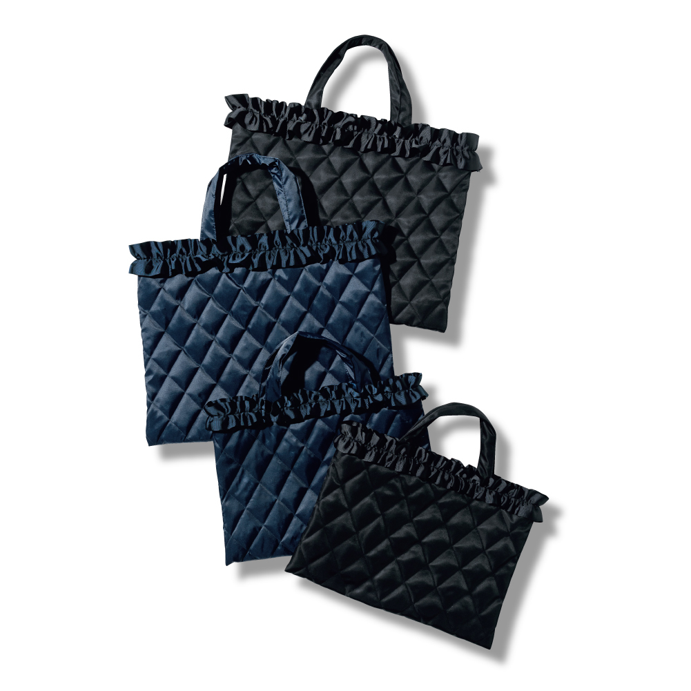 THREE SQUARE フリルサテン トートバッグ(M) ブラック、ネイビー ¥9,350
